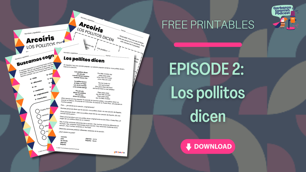 Los pollitos dicen is a popular children’s song, and now you can learn about it, all in Spanish! In Season 1 Episode 2 of the Garbanzo Spanish Podcast, Voice Artist Paulino Brener returns to share one of his favorite children’s songs with our audience. Since it is based on a song, you can learn it together in class! This episode goes great with Somos 1 Unit 1.