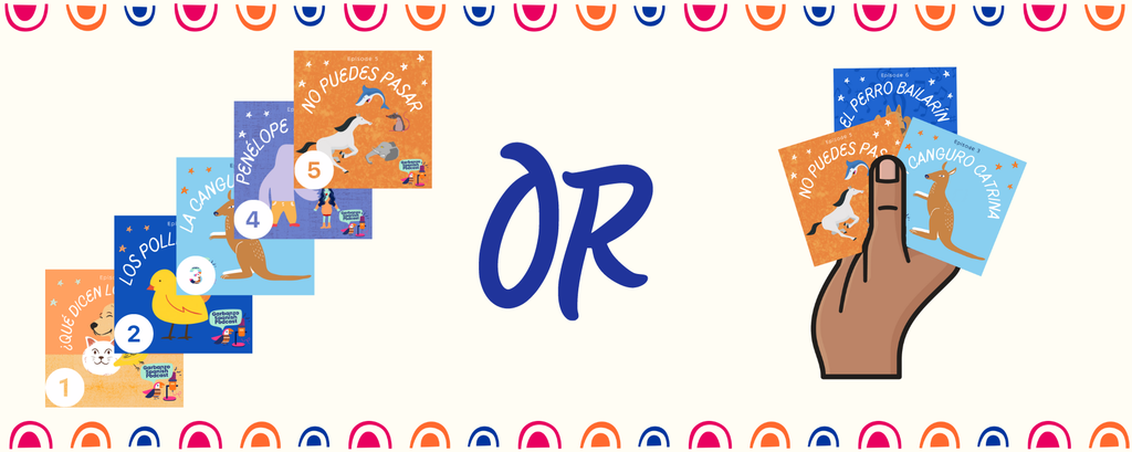 This guide contains a list of episodes, cover images, coordinating Somos unit, core vocabulary, episode length (including a time stamp for where the full story starts), and a link to the blog post containing the printables and transcript!