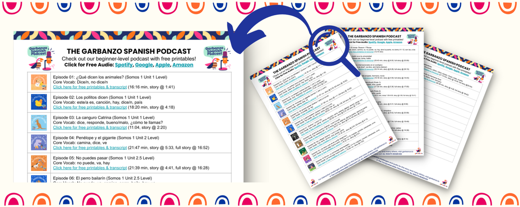 You are in luck! Along with each episode of the podcast, the Garbanzo team creates free printables to use in class! We publish a blog post to go with each episode and link the audio streaming services, the printables, a transcript, and relevant Garbanzo episodes! Access all printables and transcripts here.
